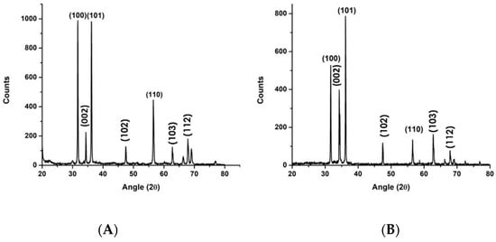 XRD patterns of the samples: (A) thin film AZO, (B) 1 mm disk AZO.
