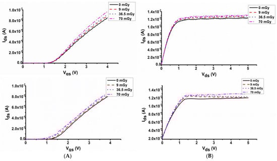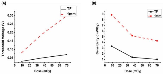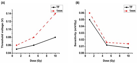 where and are the threshold voltages prior and post irradiation exposure to the film, respectively [], the detection sensitivity of the film to X-ray exposure was calculated using the following expression (Equation (4)):