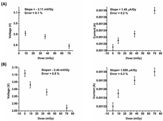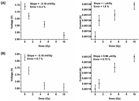 Voltage and current as a function of higher absorbed doses for (A) thin film AZO (B) disk AZO.