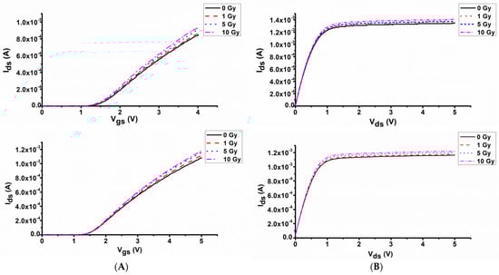In 1978, the radiation-sensitive p-channel metal oxide semiconductor field effect transistor (MOSFET) was proposed as a space-charge dosimeter, and it has since been utilized in a variety of fields, including space dosimetry, nuclear industrial research, radiation diagnostics, and radiation treatment [,]. Undoubtedly, small physical dimensions (below 4 mm2), nondestructive readout of dosimetric information, low power consumption, high dose range, and ability to read data in real-time are some of the attractive merits of MOSFETs. Therefore, MOSFET-based dosimeters are highly preferred over other types of detectors []. Despite the appeal, it is reported that ionizing radiation can result in structural flaws in the oxide layer of a MOSFET that modify the density. This alteration depends on the dose and other factors, such as the thickness of the metal oxide [,,]. Additionally, the creation of electron–hole pairs upon irradiation can generate radiolytic electrons, or holes which produce defect centers in transparent materials []. Upon electron–hole recombination process, the photoelectrons are trapped at oxygen vacancies or multivalent impurities, and the holes also self-trap at bridging or non-bridging oxygen centers []. These new electronic configurations affect the structural, optical, and electrical properties of exposed MOSFETs []. To overcome the limitation in a MOSFET with direct irradiation, an extended gate field effect transistor (EGFET) has been identified as an effective radiation detector component. Several advantages have been achieved by utilizing the FET device, which functions as a sensing element, including the cost-effectiveness of not having to re-fabricate MOSFETs, the flexibility of gate designs, the low sensitivity to fluctuations and environmental factors such as temperature and light, as well as the rapidity of dosage readouts and accuracy.