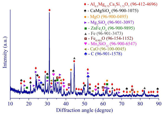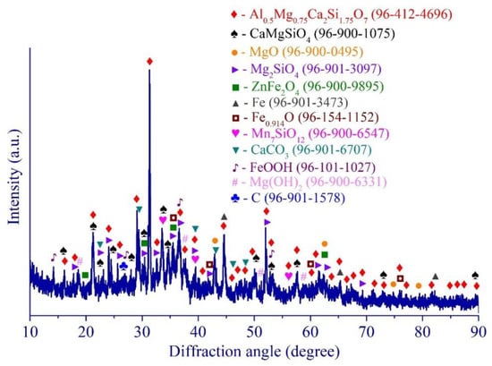 The mineralogical composition of the sample was analyzed by an ARL X’TRA (Waltham, MA, USA) diffractometer with X-rays of Cu-Kα and Match 3.12 (Germany) software [38] using the Crystallography Open Database [39]. Figure 1 shows the X-ray diffraction (XRD) pattern of the Waelz slag sample, which indicates that the main iron-free phases of the sample are melilite, monticellite, periclase and forsterite.