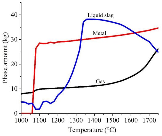 Figure 3 shows the temperature dependence of the equilibrium amounts of the metal, slag, and gas phases. As can be seen, the amount of liquid slag sharply increases above 1150 °C, achieves a plateau at 1340 °C, then decreases gradually. The amounts of the metal and gas phases grow up with the temperature rising. Evidently, the plateau reaching is associated with almost full slag melting, therefore, to separate slag and metal the temperatures above 1340 °C should be considered.