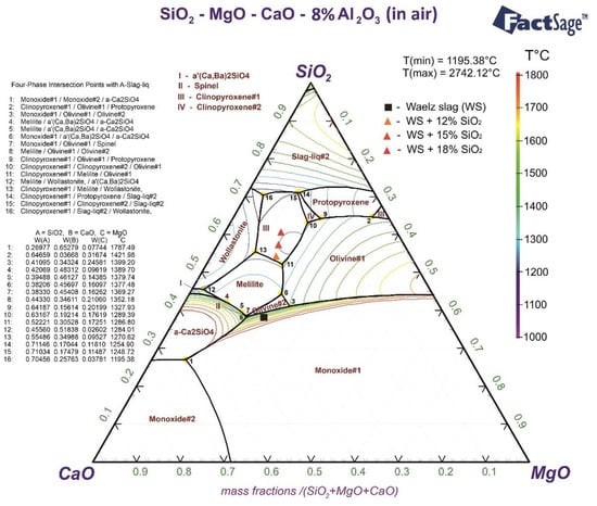 In order to separate metal and slag phases, the experiments with the addition of 12, 15, 18% pure SiO2 to 100% Waelz slag were carried out to decrease the melting point of the slag phase. Figure 6 shows the liquidus projections calculated for the CaO–MgO–SiO2–8% Al2O3 system using FactSage as well as the slag samples without and with SiO2 addition (marked by a black square and triangles, respectively). It is clear that the SiO2 addition to the Waelz slag sample shifts its composition to the pyroxene primary phase field, thereby decreasing the melting point of the system by 150–200 °C.