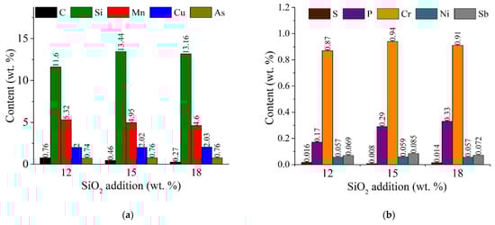 The effect of SiO2 addition to 100% of the Waelz slag on the contents of C, Si, Mn, Cu, As (a) and S, P, Cr, Ni, Sb (b) in the iron-based alloy obtained by the reduction smelting at 1750 °C.