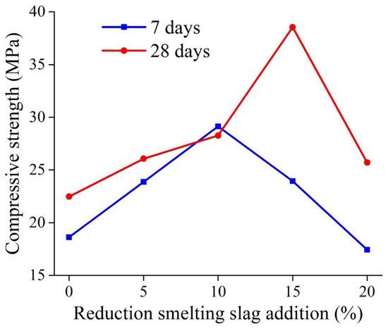The slag sample obtained by reduction smelting under the best conditions was tested as an additive to Portland cement. Comparative compressive strength tests of the Portland cement samples of CEM I 42.5 grade were carried out without additives and with the addition of 5%, 10%, 15%, 20% of the slag after 7 and 28 days of curing. The slag for the tests was crushed in a cast iron mortar; then iron metallic particles were magnetically separated. Afterwards, the samples were grinded using a Fritsch Pulverisette 7 ball mill (Idar-Oberstein, Germany) and screened through the sieve of +0.063 mm to a residue of less than 5% wt. The tests were performed by a compression testing machine IP-1000-1 (ZIM TOCHMASHPRIBOR, Russia). The compression strength of the samples was determined using cubes dimensions 2 cm × 2 cm × 2 cm with the cement-to-sand (C/S) ratio of 1/3 and the water-to-cement (W/C) ratio of 0.40 according to the Russian State Standards GOST 310.1–310.3-76, GOST 310.4-81.
