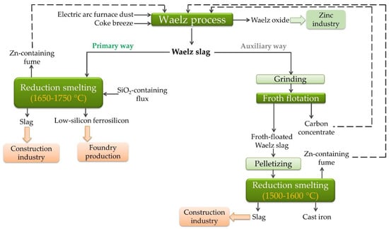 About 600–650 kg of the remaining non-evaporable by-product with a high Fe content called the Waelz slag is generated per ton of EAF dust [5]. Two types of the Waelz slag should be distinguished: lime-rich and silica-rich, with the basicity index higher than 1 and lower than 1, respectively [6]. The type of the generated slag depends on the composition of slag-forming addition used in the Waelz process. It also should be noted that contents of remaining non-ferrous metals such as Zn, Pb, Cu and other impurities such as As, Sb, Cr, P, S can vary widely [7,8]. Basicity and contents of different impurities mainly determine [6] ways of recycling the Waelz slag generated in different plants. Silica-rich slag is generally more suitable for construction industry than lime-rich slag due to the standards compliance according to the results of leaching tests. Silicate components promote the glass phase formation that often leads to a significant decrease in harmful heavy metals contents in the filtrates of the corresponding leaching tests [9]. Various studies have shown the possibility of the Waelz slag application in making of concrete [10], bricks [11,12,13,14] and photocatalysts [15,16], as well as in road construction [17], where most of the slag samples were silica-rich. The recycling of the Waelz slag in metallurgy is limited mainly due to a high content of remaining zinc, which is harmful for ironmaking process [18]. Zinc content in the Waelz slag can vary over a range of 0.2–3.8% [6]. Few authors have studied the recycling of the Waelz slag in metallurgy, namely, in a top-blown rotary converter [19], in a vertical retort [20,21], and as a charge to an electric arc steelmaking furnace [22]. However, either the published results consist of calculation without experimental verification [19,22], or even the research projects were suspended due to their inefficiency [20,21]. Nevertheless, iron is the main element of the Waelz slag, so iron metallurgy is one of the possible ways for its utilization. Currently, recycling of Fe-containing wastes is attractive due to a significant depletion of high-grade iron ore reserves and mining of iron ore deposits of lower grade and complicated mineralogy [23].