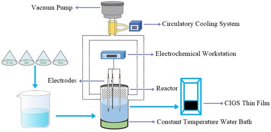A CorrTest CH310H electrochemical workstation was used for the LSV, potentiostatic polarization, EIS, and electrodeposition CIGS thin film studies. The LSV curves were measured at potentials between 0.1 V to −1.0 V (vs. SCE) with a scanning rate of 10 mV/s. The potentiostatic polarization curves were measured at a potential of −0.60 V (vs. SCE) and a polarization time of 30 min. EIS was performed at a potential of −0.60 V (vs. SCE) with a test frequency range of 0.01 Hz to 100 kHz. On electrodeposited CIGS thin films, the potential range was −0.1 V to −0.9 V (vs. SCE), and the polarization time was 30 min. When the experiment was carried out at 3 kPa, a vacuum pump was used to extract the air from the experimental system for 30 min. Figure 1 illustrates the electrodeposition process of CIGS thin films.