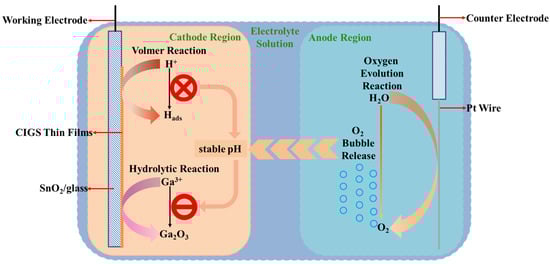 In this article, CIGS films without a low-conductivity Ga2O3 phase were prepared using vacuum electrodeposition, as supported by the conclusions of Raman and XPS. There were two main reasons for the inhibited Ga2O3 formation. The first reason is the inhibition of the H+ to Hads reaction, which decreased the consumption of H+ on the cathode surface, as confirmed by the disappearance of the Hads generation peak in the LSV curve. The second reason is that the OER reaction was promoted by a smoother electrode reaction and a decrease in the electrochemical impedance during deposition. The larger current density in the current density-time curves and the smaller semicircle diameter in the impedance Nyquist plots confirmed this. The inhibition of the H+ to Hads reaction and the promotion of the OER together stabilized the pH in the cathode region, which in turn inhibited Ga3+ hydrolysis. The path of Ga3+ into the films in the form of Ga2O3 was blocked.