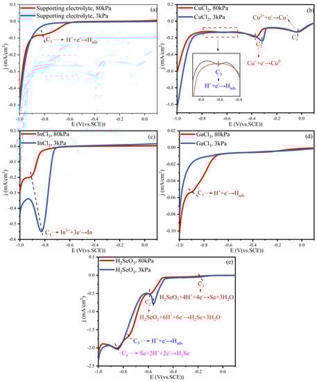Figure 4c illustrates the LSV curves of Ga-Se binary solutions at 3 kPa. The peaks C1, C2, and C3 correspond to the reaction of H2SeO3 to Se, H2SeO3 to H2Se, and Se to H2Se, respectively (Equations (5)–(7)). Because Ga2Se3 has a high standard Gibbs energy of formation (−418 kJ/mol []), Ga3+ was induced by H2Se to form Ga2Se3 [] (Equation (14)). The current densities of the peaks C2 and C3 are greater at 3 kPa, indicating that the formation of H2Se or Ga2Se3 was promoted in a vacuum environment.