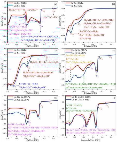 The LSV curves in the (a) Cu−Se, (b) In−Se (c) Ga−Se binary, (d) Cu−In−Se, (e) Cu−Ga−Se ternary, and (f) Cu−In−Ga−Se quaternary solutions at 3 kPa.