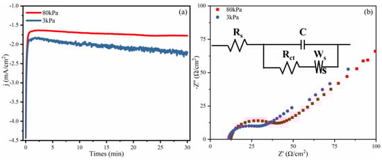 Figure 3a illustrates the effects of the vacuum environment on the hydrogen evolution potentials. Evidence of an inhibited reaction of H+ to Hads was found in a vacuum environment. Peak C1 corresponding to the reaction of H+ to Hads (Equation (1)) did not appear at 3 kPa, possibly due to a decrease in the H2 partial pressure. Because of the reduced partial pressure of H2, the overpotential of H+/Hads on the electrode surface was increased. This phenomenon has also been observed on Au and Pt electrodes [,].