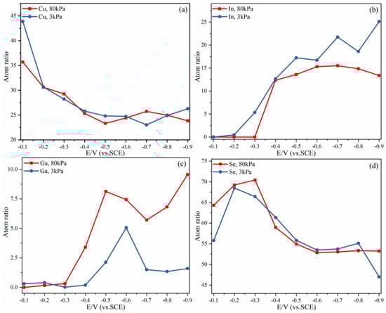 As shown in Figure 7b, the potential of In in the CIGS thin films was −0.2 V at 3 kPa. However, this potential was −0.4 V at 80 kPa. The reason may be that the formation of Cu3Se2 was promoted in a vacuum environment and In was induced by the excess Cu3Se2 to produce a more stable CuInSe2 phase, which in turn could enter the films at a lower potential. Meanwhile, the content of In in the films was higher at 3 kPa. As a result, the formation of In was promoted in a vacuum environment.