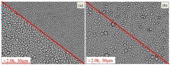 SEM images of the morphology of CIGS thin films prepared at the pressures of 80 kPa (above the red diagonal line) and 3 kPa (below the red diagonal line) and at the potentials of (a) −0.5 V and (b) −0.6 V.