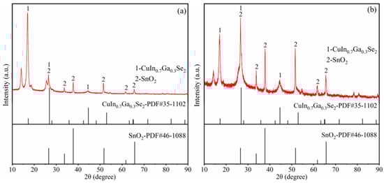XRD spectra of CIGS thin film prepared at the potential of −0.6 V and pressures of: (a) 80 kPa and (b) 3 kPa.