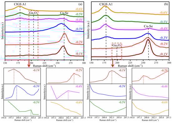 Raman spectra of CIGS thin film prepared at potentials of −0.1 V to −0.6 V and pressures of: (a) 80 kPa and (b) 3 kPa.