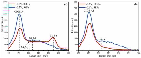 Raman spectra of CIGS thin films prepared at pressures of 80 kPa and 3 kPa and at potentials of (a) −0.5 V and (b) −0.6 V.