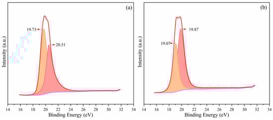 Since poorly-crystallized Ga2O3 did not produce a Raman response, this article determined the phase of Ga from the Ga 3d binding energy. The XPS spectra of the CIGS thin films are presented in Figure 12. According to Figure 11, at 80 kPa, the binding energy of 19.73 eV and 20.51 eV are related to Ga of CIGS thin films, and at 3 kPa, 19.07 eV and 19.87 eV are related to Ga of CIGS thin films. According to the literature, 19.07 eV corresponds to GaSe (19.00 eV, Ga 3d) [], and 19.73 eV and 19.87 eV correspond to Ga2Se3 (19.70 eV or 19.90 eV, Ga 3d5/2) []. In addition, 20.51 eV is close to Ga2O3 (20.50 eV, Ga 3d5/2) []. In summary, the phases of the films were Ga2Se3 and Ga2O3 at 80 kPa, while GaSe and Ga2Se3 were the phases at 3 kPa. That is to say, the formation of Ga2O3 must be inhibited in a vacuum environment.