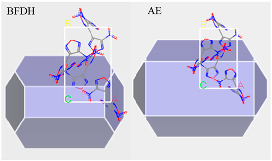 The crystal structure data of DNTF was obtained based on the Cambridge Organic Crystal Database (CCDC) and imported into the Materials Studio simulation platform. The Forcite module was used to optimize molecular configuration and energy. The following optimization parameters were set: compass force field, “medium” accuracy, and “smart” method to optimize the cell parameters. The Bravais-Friedel-Donnary-Harker(BFDH) and Attachment Energy method(AE) in the Morphology Tools module were used to predict the vacuum morphology of DNTF crystals and obtain the surface distribution of DNTF crystals grown under vacuum conditions. Theoretically, the crystalline surface with the largest surface occupation area has the most important effect on the adhesive-filler interfacial bonding performance [14,15]. In this simulation, the interfacial interaction between GAP molecules and DNTF crystals was calculated by selecting the crystal surfaces that occupied more surface area. The vacuum growth morphology of DNTF crystals is shown in Figure 1, the left is the vacuum growth morphology of DNTF crystal in BFDH model and the right is the vacuum growth morphology of DNTF crystal in the AE model. In the figure, nitrogen is shown in blue, oxygen in red and carbon in gry. The first two growth surfaces and their corresponding percentages are listed in Table 1.
