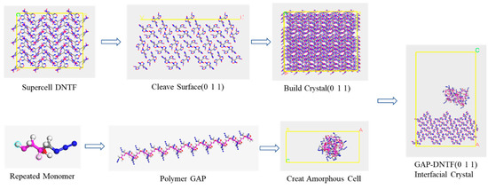 The polymer-bound explosive model was constructed as follows: Firstly, the 4 × 3 × 3 supercell structure of DNTF was built and cut along the main growth plane (0 1 1); the vacuum-free crystal structure of DNTF (0 1 1) crystal plane was constructed; the amorphous structure of GAP molecular chain (Amorphous Cell) was constructed according to its lattice size; and their bilayer interface crystal models were obtained by the Build Layers function, where the vacuum layer Repeat the above method to obtain the bilayer interface model of GAP and other crystal surfaces of DNTF. The model construction needs to be combined with the mass ratio of energetic binder GAP to DNTF in the actual experiment, so only one GAP molecular chain is selected here for AC box construction. In addition, all steps in the model construction process need to be optimized for structure so that the system exhibits the minimum energy at each step, which is because the system loses its initial structure at each step of operation and the energy will be higher than its most stable structure.