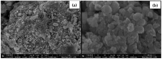 The surface morphology of CuO NPs was examined through SEM, and the obtained micrograph is given in Figure 2. The low-magnified micrograph shows a high degree of agglomeration that led to the formation larger solid structure, where small size particles are randomly distributed on the surface. Some cavities are also seen in the images, which are due to the lopsided arrangement of the particles. This shows a high precipitation rate of the synthesized particles at higher pH. Nearly similar situations are seen in the high magnification image, the complex structure is formed and the irregular arrangement of particles in several cavities with different sizes is formed. Few nearly spherical shapes and some poly headed particles are seen in the image. However, most of the individual particles are varied in size and shape. The particles size calculated through ImageJ software from the SEM image (b) are ranging from 37 nm to 54 nm with an average particle size of 49.75 nm.