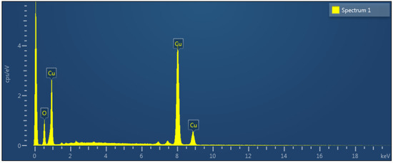 The Panalytical X-pert pro (manufactured by CAE, Montreal, QC, Canada) was run between 20° to 80°, to study the crystalline phase, where the crystallite size was calculated the Debye-Scherrer equation (Equation (1) where K is Scherrer constant, D is particle size in nm, β is full length at half maxima and λ is the wavelength of X-ray). The surface structure was examined through SEM model 5910 (Tokyo, Japan) whereas the EDX model INCA 200 (Abingdon, UK) fixed SEM was used for elemental analysis. The thermogram was recorded by Perkin Elmer Model 6300 TGA analyzer (Hillsborough, NJ, USA) by heating a known amount of CuO NPs was heated up to 900 °C with a 10 °C rise per min. The light absorption phenomena were observed in the UV-Visible spectrophotometer model Shimadzu (UV-800) in the range 200 to 800 nm provided by Thermo Fisher Scientific Waltham, MA, USA. The KBr pellet containing CuO NPs was examined using an FTIR model Nicolet 6700 (Waltham, MA, USA) in the 4000 to 400 cm−1 range to determine the chemical composition.