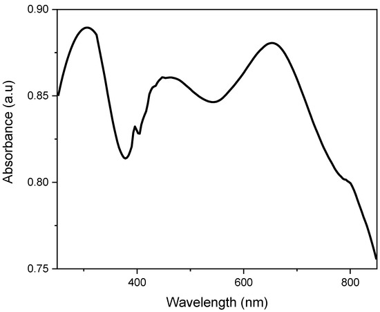 The UV-Visible spectrum exhibits a wide wave band center at 306.42 nm confirming the synthesis of CuO NPs as shown in Figure 5 and is attributed to the oscillation of the excited electrons due to the absorption of electromagnetic radiation [23]. A short absorption band at 395.71 nm and the two other broad absorption peaks centered at 448 and 652 nm might be due to the conversion of non-oxidized Cu-NPs to copper colloid [29]. As the surface Plasmon resonance (SPR) is very sensitive to the nature of particles, inter-particles distance, their size, and shape [30]. This shows that the sample absorbs both UV and Visible light and wide wave bands attributed to the wide size distribution of CuO NPs [31]. The band gap energy is the amount of energy required to excite electrons from the valance band to the conduction band. According to earlier findings, the wavelength of the absorption edge was determined by aligning the steep rising part of the UV-Vis curve with the x-axis of the UV-Visible spectrum. On the basis of the absorption edge, the band gap energy was calculated (band gap = 1240/absorbance edge (nm)) to be 1.48 eV, which is lower than the reported band gap values (1.63 and 1.75 eV) for CuO NPs synthesized by a conventional method, suggest that plant-mediated CuO NPs have high conductivity [32].