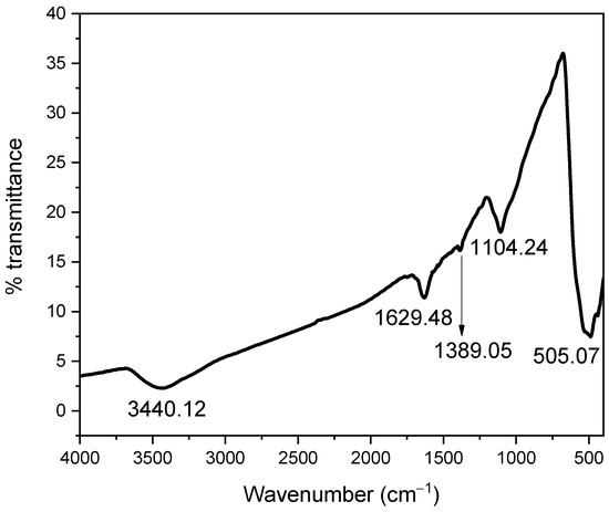 The broad band centered at 3440.12 cm−1 in the FTIR spectrum of CuO NPs (shown in Figure 6) is assigned to the stretching vibration of the O–H group [33]. The wave band at 1629.48 and 1102.24 cm−1 is due to bending vibrations of the hydroxyl group [34]. The peak at 1389.05 cm−1 is due to the organic moieties, which may be due to the use of plant material [35]. The synthesis of CuO NPs with monoclinic geometry was confirmed by the absorbance bands at 505.07 cm−1 [36].