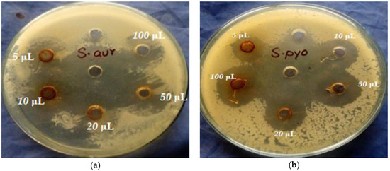 The antibacterial test was performed against both types of bacterial species by using the Agar well diffusion method. The overnight bacterial culture growth on agar nutrient media was dissolved in newly produced agar medium, then placed into sterile Petri plates, and allowed to solidify. The micropipette tip was used to bored 5 mm wells in agar media, and this procedure was carried out at room temperature in laminar flow. The CuO NPs stock suspension (5 mg/50 mL) was prepared by irradiation under ultrasonic waves. The Petri plates were incubated at 37 °C for 24 h after the wells were loaded with 5, 10, 20, 50, and 100 μL, and the diameter of the inhibition was measured as the activity of CuO NPs [25].