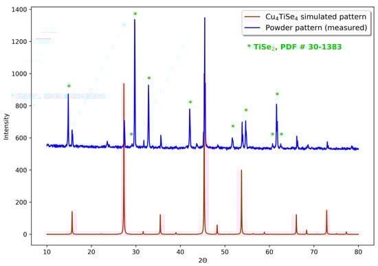 The powder pattern of the synthesis product confirms that we obtained a new powder pattern phase, unknown in the database, along with some amount of titanium(IV) selenide, TiSe2 (Figure 1; the pattern was simulated using Mercury software [32]). The powder pattern simulated based on the crystal structure of Cu4TiSe4 resolved in this study fits perfectly to unidentified reflexes, which proves the occurrence of Cu4TiSe4 in the sample and justifies the resolved structure, described later in the text.