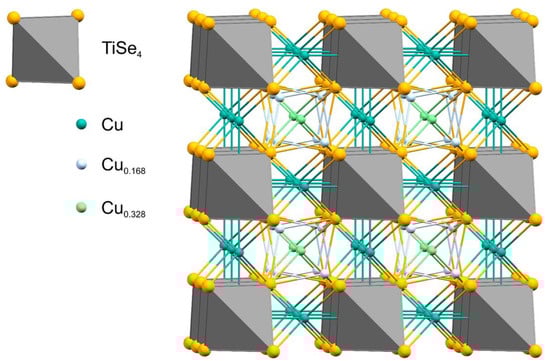Tetrahedral anions TiSe44−, analogous to TiS44−, were reported for the first time in compound Tl4TiSe4 and then in compound Na4TiSe4, both crystallizing in the monoclinic system [11,12]. Changing the cation to Cu+ gives Cu4TiSe4—a compound with a cubic structure [13]. Recent studies of tetracopper tetraselenotitanate, Cu4TiSe4, show its utility due to its exhibition of ultralow lattice thermal conductivity, a bandgap value lying in the optimal range for solar absorber material, and a light absorption coefficient in the visible range greater than 105 cm−1, making it a promising thermoelectric and solar energy material [13,14].