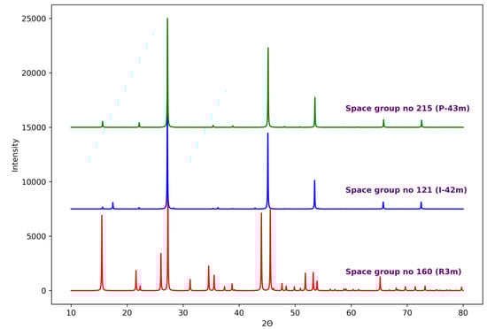 The Uspex algorithm was used to predict the crystal structure of Cu4TiSe4 and to scrutinize the occurrence of polymorphic structures. Recently, in the case of Cu3VSe4, it predicted the observed experimentally cubic structure as the global minimum of enthalpy for this chemical composition and—at the same time—it proposed two new theoretical polymorphs [16]. Due to its stochastic nature, the Uspex algorithm was run five times and each time it had no problems with convergence—it finished calculations within a dozen generations. Such a result is far below the allowed maximal limit of generations. The algorithm in each case converged to the same global minimum, which is a rhombohedral crystal structure (space group R3m) with an enthalpy value of −41.335 eV, in just several generations. However, the Uspex algorithm also found two other minima of enthalpy corresponding to structures from tetragonal and cubic crystal systems—characterized by space groups I-42m and P-43m, respectively. The enthalpy values of these two structures are quite different, −41.262 (I-42m) and −41.199 eV (P-43m). Figure 5 shows the simulated powder diffraction patterns of all the different Cu4TiSe4 structures found by the Uspex algorithm, proving that they are distinct from each other. Patterns were simulated using Mercury software [32]. The typical experimentally observed crystal structure for the Cu4TiSe4 compound is the cubic structure, however, the predicted theoretically cubic structure is different from the experimental one (as one may see by comparing the simulated powder patterns in Figure 1 and Figure 5), although it exhibits the same symmetry and very similar lattice parameter (theoretical a = 5.672 Å vs. experimental a = 5.652 Å). The theoretical cubic structure shows no structural disorder.