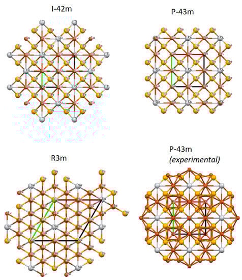 It should be emphasized that the global minimum of enthalpy for the composition Cu4TiSe4 found by the Uspex algorithm (space group R3m) is totally different than the experimentally observed crystal structure (disordered, space group P-43m), as revealed in Figure 6. More comparisons of views of crystal structures of Cu4TiSe4, along the b-axis and reciprocal b-axis, are presented in Figures S3 and S4 in the Supplemental Material. First of all, in the case of the CdBi2S4 compound, it was shown previously that “the Uspex algorithm is not capable of predicting crystal structures with the structural disorder” [15]. Secondly, the algorithm reached a crystal structure similar to the experimental one in the case of symmetry and lattice parameters, but without the structural disorder (which is characteristic of Uspex) and only as a local minimum of enthalpy. It seems that the rhombohedral theoretical structure is not the real global minimum of enthalpy and thus was not obtained in the synthesis performed in this study. At the same time, the incorporation of structural disorder into the theoretical (ordered) cubic structure likely decreases its enthalpy, making the disordered cubic structure the real global minimum of enthalpy. Interestingly, a phase transition from a disordered cubic P-43m structure to a partially ordered rhombohedral R3m structure at −92°C was reported, adding further proof of the usefulness and verifiability of the Uspex algorithm [39].