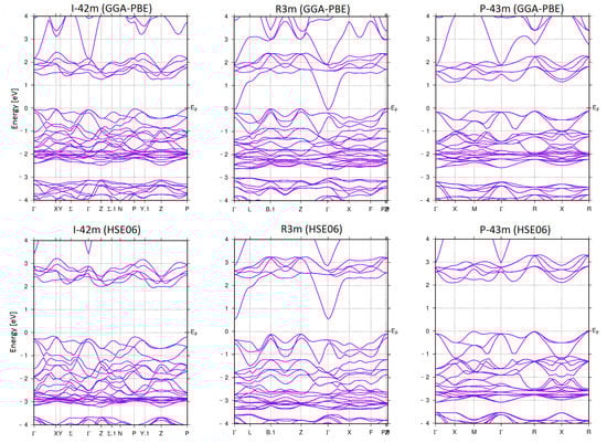 The simulated electronic band structures across the high symmetry points of the corresponding Brillouin zones for each theoretical Cu4TiSe4 polymorph are presented in Figure 7. We compare both approaches—the GGA-PBE and HSE06 approximations.