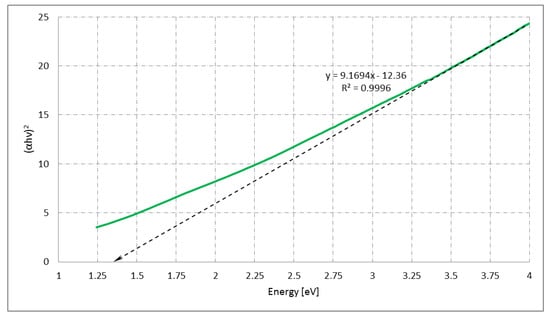 The experimental investigation of the optical bandgap of bulk Cu4TiSe4 (Figure 8) reveals the direct transition with a bandgap value of 1.35 eV. Such a result is in great correspondence with the value reported before (1.34 eV) by Chen and coauthors and also lies in the optimal range of the Schockley–Queisser limit [13,42]. The indirect transition was not observed in our study.