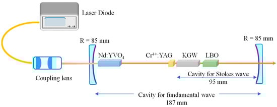 The coupled cavity for the SRS process was formed by the coated KGW crystal and the output coupler. The geometric length of the coupled cavity for the Stokes wave was approximately = 95 mm. The optical length for the SRS cavity is given by:
