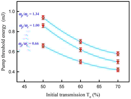 The polarization states for the fundamental and Raman Stokes waves were self-controlled to be linearly polarized due to the gain anisotropies in the a-cut Nd:YVO4 and Np-cut KGW crystals, respectively. The pump power of the laser diode was electronically operated at a pump duration of 40 μs with a pump frequency of 10 kHz. Figure 2 shows the experimental results for the pump threshold energy at 808 nm versus the initial transmission To of the saturable absorber under three different pump-to-mode size ratios ωp/ωc for the output pulse rate to reach the pump rate of 10 kHz. The pump threshold energy was found to increase with a decrease in the initial transmission To, because a lower initial transmission To led to a larger stored energy in the laser crystal. On the other hand, the pump threshold energy increased with an increase in the ratio ωp/ωc. The increasing trend was confirmed to be proportional to the effective mode area , consistent with the theoretical analysis []. For the case of ωp/ωc = 1.34, the pump threshold energy was seen to increase from 0.58 to 0.94 mJ as the initial transmission To lowered from 70% to 50%.