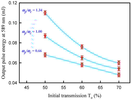 Experimental results for the output pulse energy at 589 nm versus the initial transmission To of the saturable absorber for three different pump-to-mode size ratios ωp/ωc.