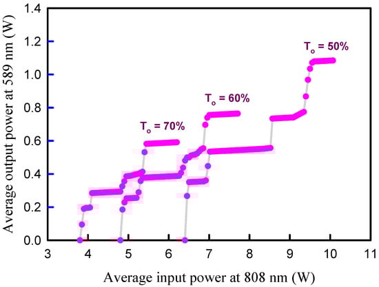 Figure 4 shows the experimental results for the average output power at 589 nm versus the average input power at 808 nm for three different initial transmissions To of the saturable absorbers when ωp/ωc = 1.34. It was obvious that there were steps for the different passive Q-switchers. The final step for each saturable absorber shown in Figure 4 represented an output pulse rate equal to the pump rate of 10 kHz. The steps before the final step revealed the output pulse rate to be a fraction of the pump rate. Nevertheless, it is easier to estimate the real efficiency of the laser from Figure 4.