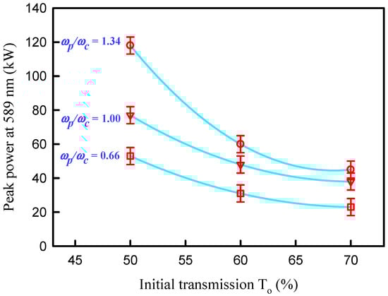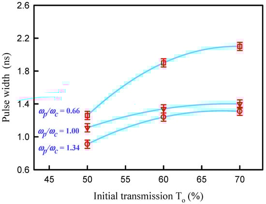 Figure 5 shows the experimental results for the pulse width at 589 nm versus the initial transmission To of the saturable absorber for three different pump-to-mode size ratios ωp/ωc. The pulse width was seen to shorten with a decrease in the initial transmission To for a given ratio ωp/ωc. The overall pulse width was seen to be as short as 0.91 to 2.1 ns for the three different ratios ωp/ωc and three initial transmissions To. The pulse shortening effect can be clearly seen due to the intracavity stimulated Raman scattering in passive Q-switched lasers [,,,]. As shown in Figure 3, the enlargement in the pump-to-mode size ratio ωp/ωc could lead to an increase in the output pulse energy. Similarly, the pulse width could be narrowed by increasing the pump-to-mode size ratio. Using ωp/ωc = 1.34 for the saturable absorber with To = 50%, the pulse width was experimentally found to be as short as 0.91 ns.