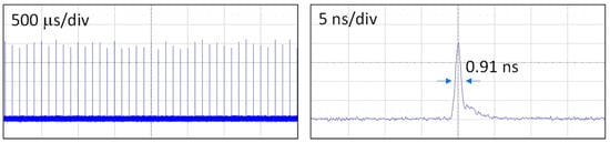 The peak-to-peak fluctuation in the pulse train could be optimized to be approximately ±5.5%. The typical pulse train and temporal profile for the orange output at 589 nm obtained with ωp/ωc = 1.34 and To = 50% are shown in Figure 6. The temporal profile revealed the output pulse to be a pure single pulse without a satellite pulse. Furthermore, no significant modulation was observed in the temporal profile of the output pulse. Accordingly, the number of longitudinal modes seemed to be close to the number of single modes. The selection of the longitudinal modes may be attributed to the shortness of the coupled cavity and the several etalon effects caused by the small separations among the Cr4+:YAG, KGW, and LBO crystals. On the other hand, the spatial quality of the output beam was also examined. The beam quality factor M2 was measured by the traveling knife-edge method. The overall beam quality was found to be within 1.5~2.0 at an output rate of up to 10 kHz for the three different saturable absorbers.