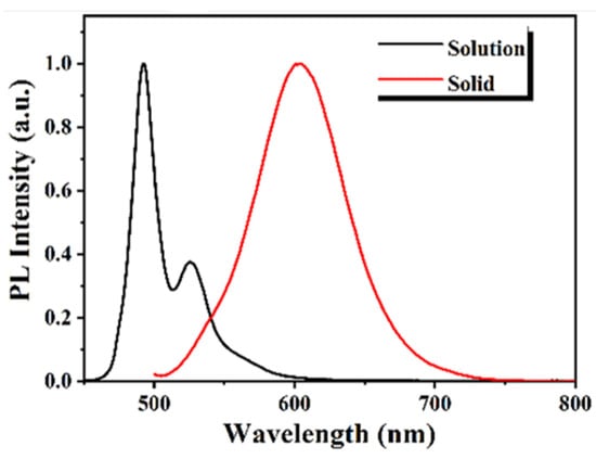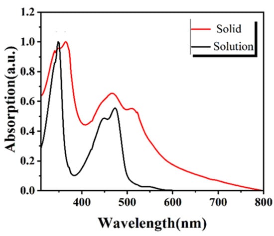 Figure 1 shows the UV-vis absorption spectra of TAPy solid and dissolved in dichloromethane solution. It can be seen that TAPy has characteristic absorption peaks at 345 nm and 457 nm, and, similarly, TAPY solid has a similar absorption peak to its solution, but there is another absorption peak at 510 nm. This indicates that the solid state of TAPy has a similar aggregation state and planar structure with that of the solution state, but due to the difference of the degree of molecular dispersion and the solubility in different solvents, the difference of the absorption curve appears in the solution [22,26]. On the other hand, for the fluorescence emission spectrum of TAPy (Figure 2), the absorption peak of solid TAPy has a significant redshift compared with the solution. This is also due to differences in the aggregation state and molecular morphology of the TAPy molecule [26].