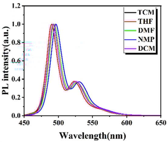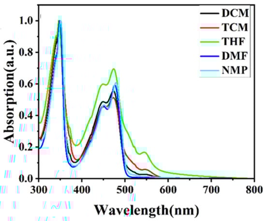For the solute discolouration effect of TAPy, Figure 3 shows the UV-vis absorption spectra of TAPy in different solvents. It can be seen that the UV absorption curves of TAPy in different solvents are almost identical. This is because the molecules have a more similar molecular plane structure and aggregation state in these solvents (compared with solutions and solids). Figure 4 shows the fluorescence emission spectra of TAPy in different solutions, in agreement with the conclusions obtained from the UV absorption curves. It can also be seen from Table 1 that the absorption and emission peaks of TAPy in different solvents are very similar in position, which is also in line with the above conclusions.