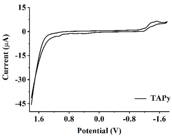 The energy band structure of the product TAPy was tested with cyclic voltammetry (CA), and Figure 5 shows the cyclic-voltammetric curve of compound TAPy. According to Figure 5, the onset oxidation potential and the onset reduction potential of TAPy are approximately −1.19 eV and 0.91 eV, respectively. Further, based on the equations EHOMO = −[Eonsetox − E1/2, Fc + 4.8] eV and ELUMO = −[Eonsetred − E1/2, Fc + 4.8] eV [27,28], it can be estimated that the homo and LUMO energy levels of TAPy are −5.51 eV and −3.41 eV, respectively.