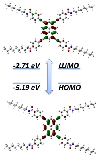A schematic DFT simulation of compound TAPy is shown in Figure 6. The planar rigid structure of the olefin is linked to the pyrene structure, facilitating intramolecular charge transfer. Symmetrical electron-donating side chain groups are linked to the pyrene nucleus via the alkyne, while the pyrene nucleus of the dense ring aromatic structure becomes the acceptor. When the molecule is in the excited state, the electron distribution tends to favour the alkyne structure, whereas in the steady state the electron distribution increases in the pyrene nucleus. Not only that, because it is a symmetrical group structure, the electronic distribution of the whole molecule is symmetrical. The modification of chemical groups changes the electronic distribution of materials and thus affects their photoelectric properties [28].