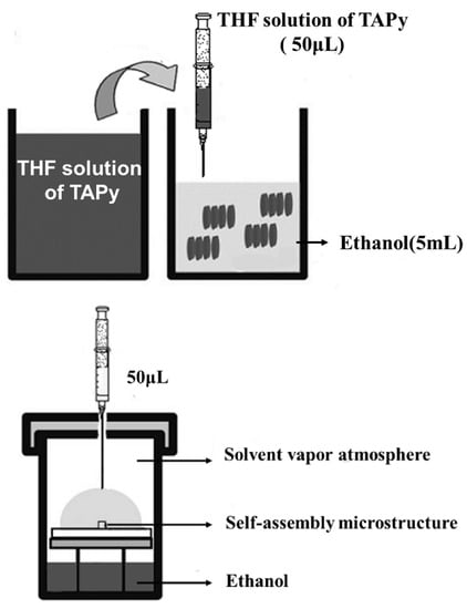 When the molecule of TAPy is transferred from the benign solvent (THF) with high solubility to the poor solvent (ethanol) with low solubility, the molecule of TAPy will separate out and assemble into a regular structure by π -π* stacking and hydrogen bonding. In the solvent with poor molecules, due to the poor interaction between the molecules and solvent, the π -π* stacking and hydrogen bond interaction will be relatively strong, and thus the molecules will self-assemble. This is a common self-assembly method used for the self-assembly of linear nano-or micro-structures of π-conjugated organic molecules [30,31]. The self-assembly procedure consists of rapidly injecting a small volume (50 μL) of a concentrated THF supersaturated solution of TAPy (0.001 M) into a larger volume (5 mL) of ethanol and mixing immediately (as shown in Figure 7).