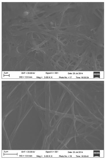 The compound TAPy was self-assembled using a solvent-exchange method and then characterised for its morphological features. It can be seen from the SEM image of Figure 8 that the self-assembly of TAPy forms a dendritic or reticulated-like structure. Pyrene and triple bonds form a large rigid π-conjugated planar molecular structure, which promotes π-π stacking and strong intermolecular interactions, resulting in a macroscopically regular structure, while amide bonds promote the formation of different molecular bonding hydrogen bonds and also facilitate the formation of molecular self-assembly structures. The failure to produce a more dense and regular structure may be somewhat related to the spatial site resistance created by the TAPy side groups, in addition to environmental, solvent and other reasons. This has similar results to previous studies [30,31,32].