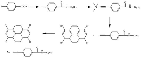 Pyrene is a kind of fused aromatic hydrocarbon with large planar structure which attracts the attention of many scientists for its low cost, excellent photoelectric properties and good chemical stability [16,17,18]. Pyrene derivatives are widely used in nonlinear optics, photoluminescence and other fields, and have great potential for the self-assembly of disk molecules [18]. On the one hand, the pyrene nucleus facilitates the planarization of the derived molecule and thus macroscopically promotes the self-assembly of the molecule due to its electron-rich and correspondingly planar rigid structure [19,20,21]. On the other hand, the alkyne bond, a common structure in organic optoelectronic materials, has been shown to play an important role in improving the electron distribution and energy of the molecule and in reducing the spatial site resistance between rigid groups [22,23].