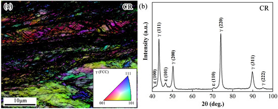 Microstructure of the CR specimen: (a) EBSD IPF + IQ map and (b) X-ray diffraction intensity profile.