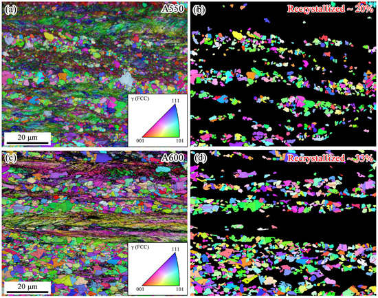 EBSD inverse-pole-figure (IPF)+ image-quality (IQ) maps and corresponding recrystallization IPF maps of (a,b) A550 and (c,d) A600 specimens, respectively.