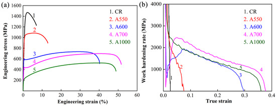 In Figure 4, the A600 and A700 specimens exhibit discontinuous yielding behavior, while other specimens demonstrate continuous yielding. Discontinuous yielding was normally observed in metals with grain sizes in the near-micrometer range, which was attributed to a lack of dislocation sources [29,30,31]. The tensile properties strongly depend on the microstructure. The CR specimen possesses the highest yield strength (YS) and ultimate tensile strength (UTS) with the lowest uniform elongation (UE). The ultrahigh YS was due to the high prestored dislocation density introduced by 80% cold rolling. The limited UE was attributed to early plastic instability, which resulted from limited work-hardening capacity (see Figure 4b). With the increase of annealing temperature, YS and UTS decrease, while UE and work-hardening rate increases, owing to recrystallization and recovery. It is worth noting that the A700 specimen with d = 3.1 μm exhibits a higher UE than that of the A1000 specimen with d = 42.1 μm, which is mainly ascribed to extensive work-hardening ability. Therefore, grain size refinement is an effective method to simultaneously increase strength and ductility. Moreover, the tensile test results indicate that the YS can be enhanced by grain refinement and partially recrystallized structure, which is consistent with previous reports [31,32,33,34,35].